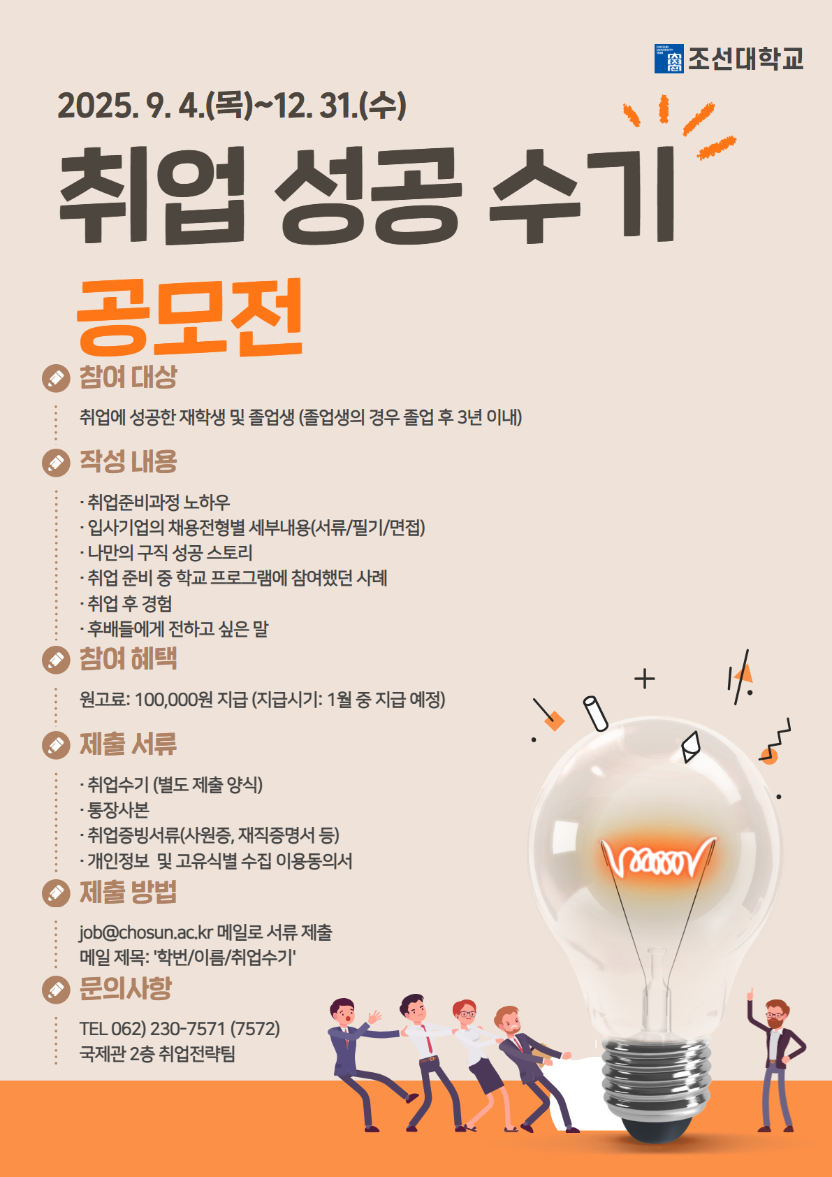 • 제출 방법: 첨부파일 작성 후 job@chosun.ac.kr 메일로 서류 제출 *메일 제목: '학번/이름/취업수기'