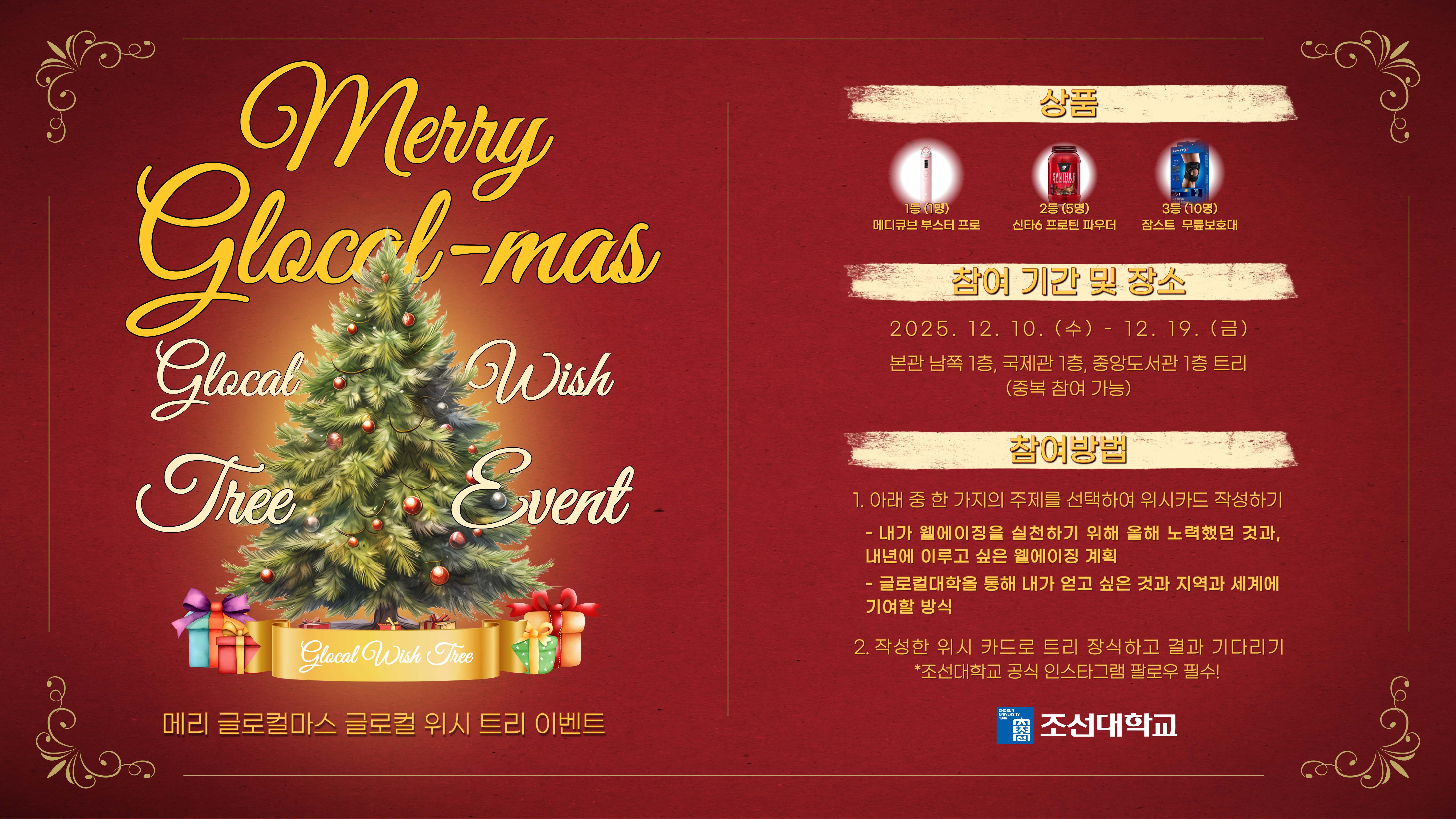 - 내가 웰에이징을 실천하기 위해 올해 노력했던 것과, 내년에 이루고 싶은 웰에이징 계획 - 글로컬대학을 통해 내가 얻고 싶은 것과 지역과 세계에 기여할 방식 한 개의 질문을 선택하여 위시 카드에 답변을 적고 트리에 걸어주세요! 공정한 심사를 통하여 총 16분께 선물을 드립니다! 📌 참여기간 - 2025. 12. 10. (수) ~ 12. 19. (금) 📌 참여장소 (중복 참여 가능) - 본관 남쪽 1층, 국제관 1층, 중앙도서관 1층 트리 📌 경품 🥇 1등: 메디큐브 부스터 프로 🥈 2등: 신타6 프로틴 파우더 초코맛 🥉 3등: 잠스트 러닝 무릎보호대 재학생 & 대학 구성원 여러분의 많은 참여 바랍니다! 올해의 마지막 순간, 함께 따뜻하게 채워요. 🎅✨