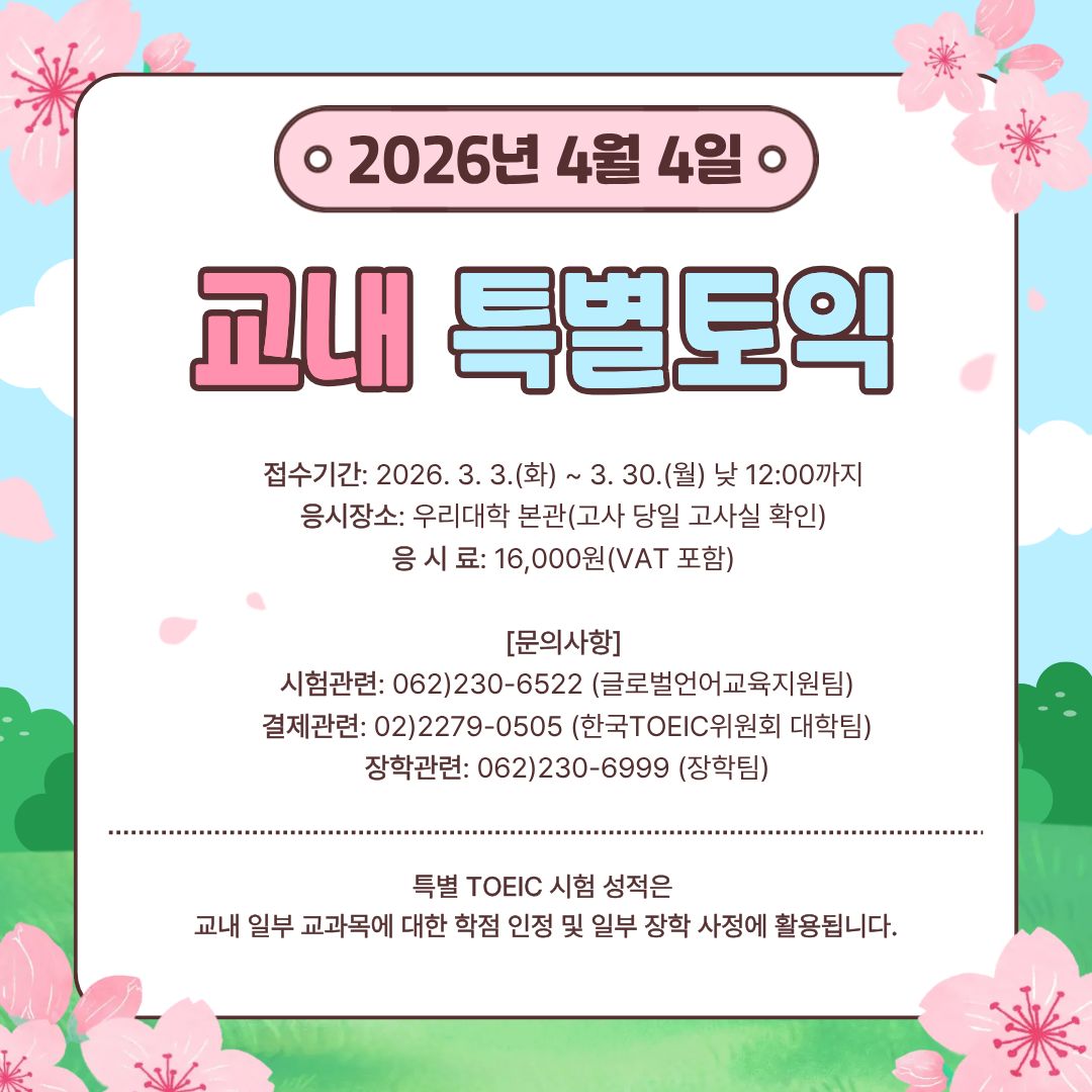 YBM 한국TOEIC위원회 주관 본교 특별 TOEIC 시험 성적은 교내 일부 교과목에 대한 학점 인정 및 일부 장학 사정에 활용되므로 학생 여러분들의 많은 관심과 적극적인 참여를 바랍니다.