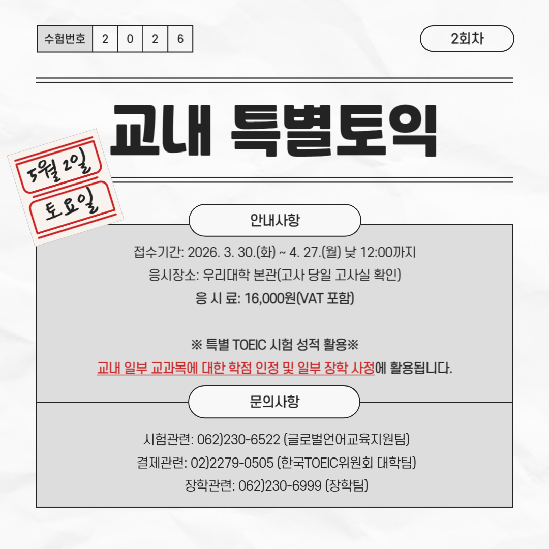 YBM 한국토익위원회 주관 본교 특별 TOEIC 시험 실시 안내(5.2.(토))
