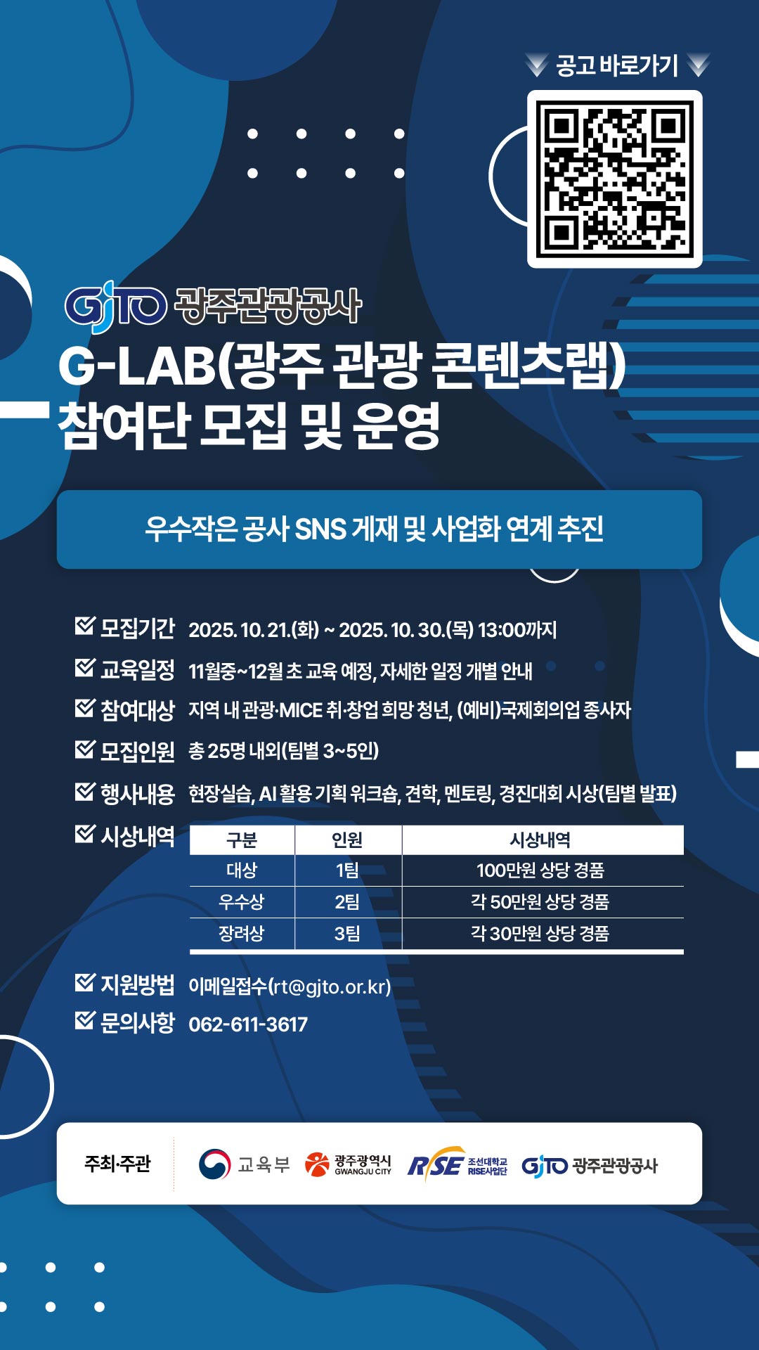 조선대학교 RISE사업단은 광주관광공사, 호남신학대학교와 협업하여광주 관광 콘텐츠랩(G-LAB) 참가자를 모집하고 있습니다.