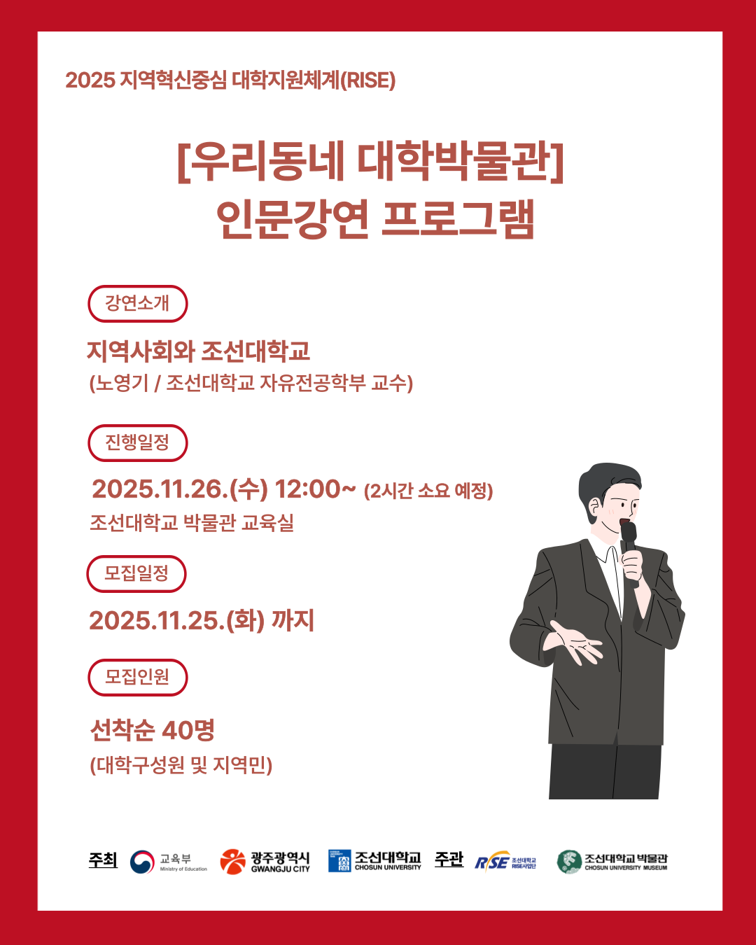 2025 [우리동네 대학박물관] 인문강연 프로그램 3회차 안내 조선대학교 박물관에서 지역과 사람, 그리고 이야기를 담은 세 번째 인문강연이 열립니다. 🌿 📍강연 안내 〈지역사회와 조선대학교〉노영기 (조선대학교 자유전공학부 교수) 일시 | 2025.11.26.(수) 12:00~ (2시간 소요 예정) 장소 | 조선대학교 박물관 교육실 정원 | 선착순 40명(대학구성원 및 지역민) ❤ 신청 방법 📍더조아시스템 내 ‘박물관 인문강연 프로그램’ 클릭 📍구글폼 신청 → 🔗 https://forms.gle/ewWge6rzGDFtqVV1A ※ 신청기한 : 11.25.(화) 까지 ※ 신청은 선착순으로 마감됩니다. 본 강연은 2025 #지역혁신중심대학지원체계(RISE) 의 지원을 받아 진행됩니다. 주최 | 교육부 · 광주광역시 · 조선대학교 주관 | 조선대학교 RISE사업단 · 조선대학교 박물관 💛 참고사항 ✔ 참가비 : 무료 ✔ 선착순 접수이며 이후 개별 문자 통보 ✔ 간단한 간식 제공(선착순 40명 신청 기준) ✔ 예약 취소 : 교육 일정 3일 이전까지 💚 인스타그램 | @chosun_museum 💚 홈페이지 | https://www.chosun.ac.kr/museum 💚 문의 | 062) 608-5096 (교육 담당자) ✨ 지역의 이야기를 담은 인문학 한 걸음, 박물관에서 함께 걸어요.