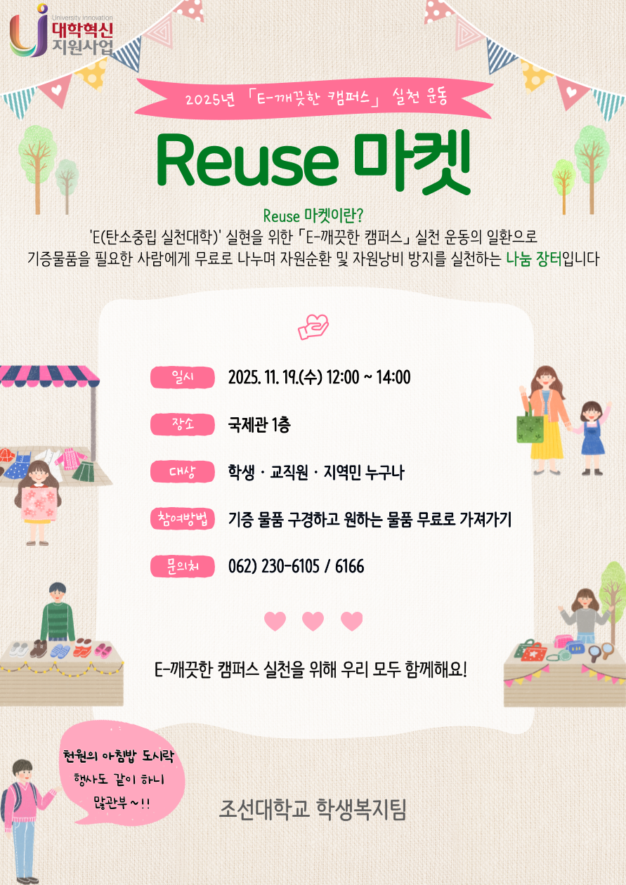 대학혁신지원사업 2025년 「E-깨끗한 캠퍼스」 실천 운동의 일환으로 Reuse 마켓을 운영합니다.