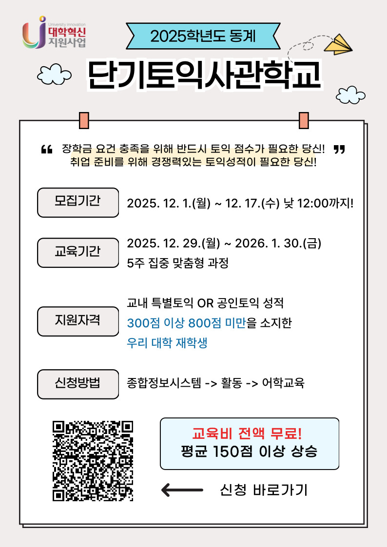 ★토익점수 300점부터 지원 가능★ 2025 동계 단기토익사관학교 안내(교육비 무료)