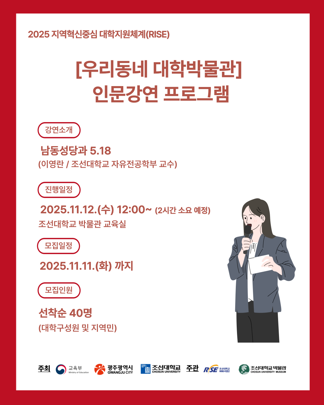 2025 [우리동네 대학박물관] 인문강연 프로그램 2회차 안내 조선대학교 박물관에서 지역과 사람, 그리고 이야기를 담은 두 번째 인문강연이 열립니다. 🌿 📍강연 안내 〈남동성당과 5.18〉이영란 (조선대학교 자유전공학부 교수) 일시 | 2025.11.12.(수) 12:00~ (2시간 소요 예정) 장소 | 조선대학교 박물관 교육실 정원 | 선착순 40명(대학구성원 및 지역민) ❤ 신청 방법 📍더조아시스템 내 ‘박물관 인문강연 프로그램’ 클릭 📍구글폼 신청 → 🔗 https://forms.gle/ewWge6rzGDFtqVV1A ※ 신청기한 : 11.11.(화) 까지 ※ 신청은 선착순으로 마감됩니다. 본 강연은 2025 #지역혁신중심대학지원체계(RISE) 의 지원을 받아 진행됩니다. 주최 | 교육부 · 광주광역시 · 조선대학교 주관 | 조선대학교 RISE사업단 · 조선대학교 박물관 💛 참고사항 ✔ 참가비 : 무료 ✔ 선착순 접수이며 이후 개별 문자 통보 ✔ 간단한 간식 제공(선착순 40명 신청 기준) ✔ 예약 취소 : 교육 일정 3일 이전까지 💚 인스타그램 | @chosun_museum 💚 홈페이지 | https://www.chosun.ac.kr/museum 💚 문의 | 062) 608-5096 (교육 담당자) ✨ 지역의 이야기를 담은 인문학 한 걸음, 박물관에서 함께 걸어요.