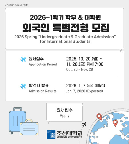 Chosun UniversityGlobal Leader 지금, 시대의 맨 앞에서 더 큰 인재, 더 넓은 미래를 향한힘찬 날갯짓으로 찬란한 내일의 아침을 열어갑니다.